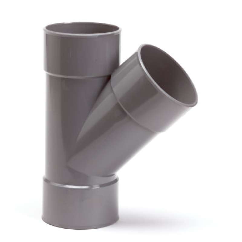 Dit 45° T-stuk is uitgevoerd in 3x inwendig lijm en wordt gebruikt voor binnenriolering.