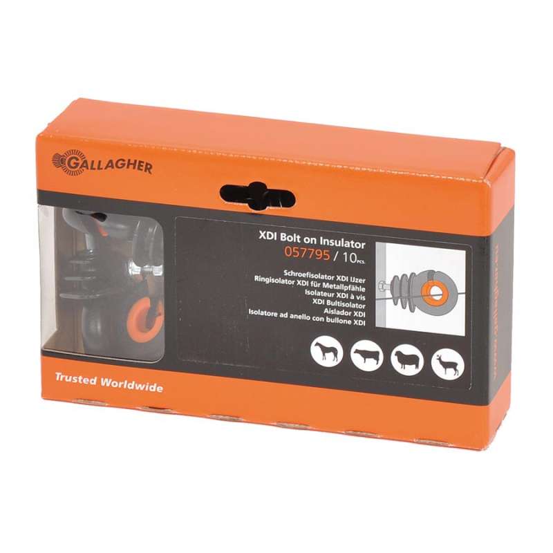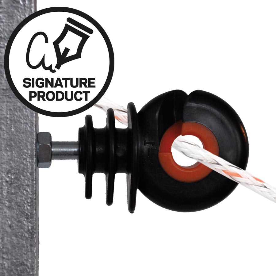 Zeer solide schroefisolator met metalen kern. Door de oranje ring is de afstand tussen de kern en de geleider overal gelijk, waardoor kortsluiting nihil is. Geschikt voor de toepassing van (kunststof) draad en cord op een ijzeren paal, zoals de haspe